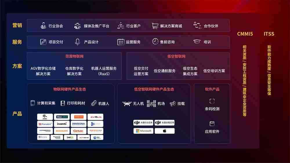 聚合国内外先进的物联网硬件产品品牌,,聚焦数字化仓储、、机器人运营、、低空智联网等领域,,,共同打造适合客户业务场景的解决方案并提供交付服务